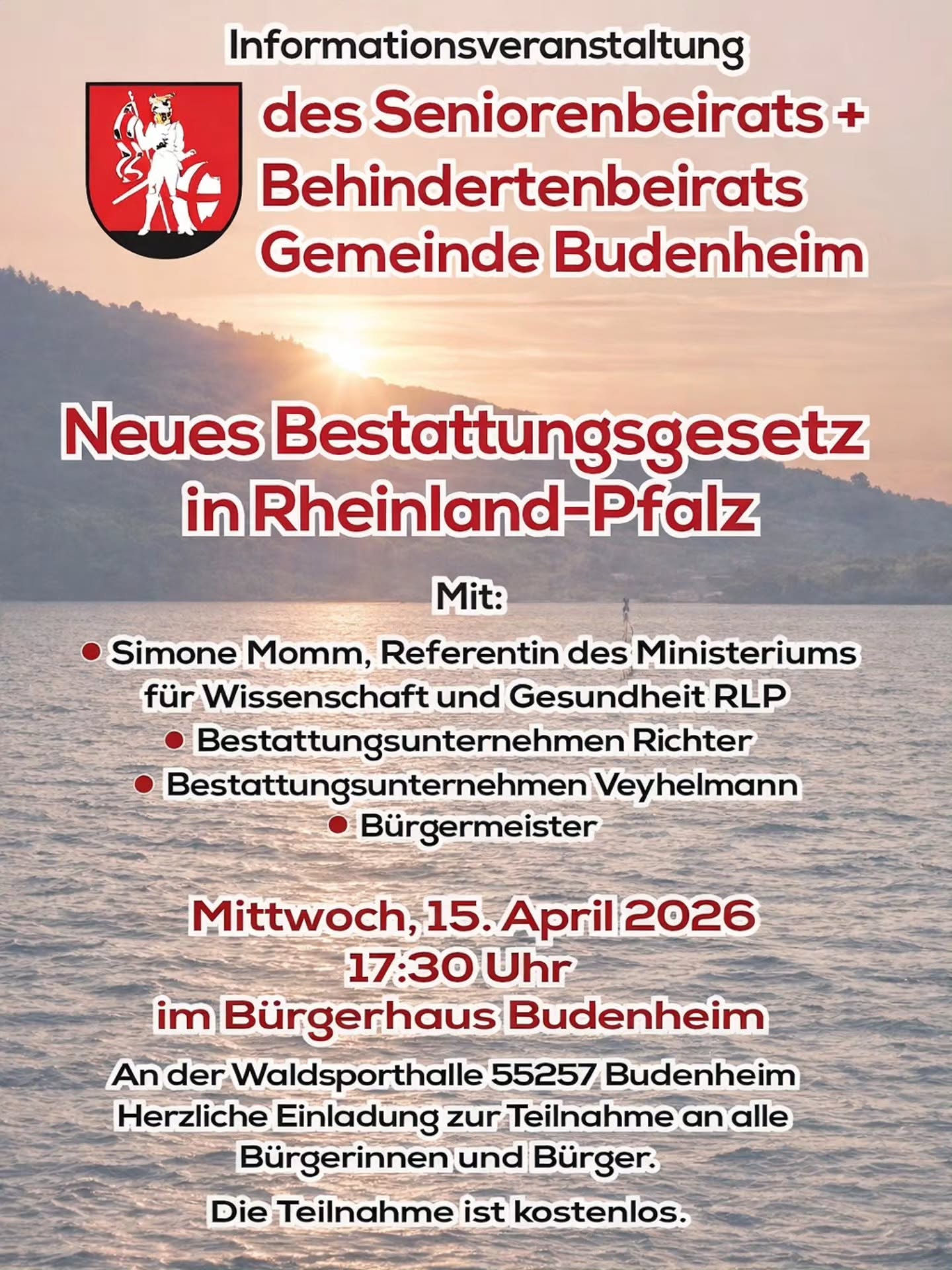 Gemeinsam mit dem Seniorenbeirat und dem Behindertenbeirat der Gemeinde Budenheim laden wir zu einer öffentlichen Informationsveranstaltung ein. Fachleute aus dem Ministerium sowie Vertreter regionaler Bestattungsunternehmen geben Einblicke, erklären die wichtigsten Neuerungen und stehen für Fragen zur Verfügung.