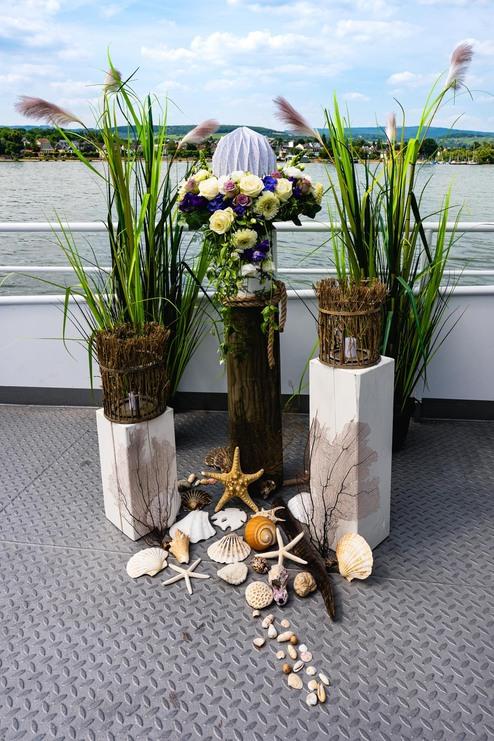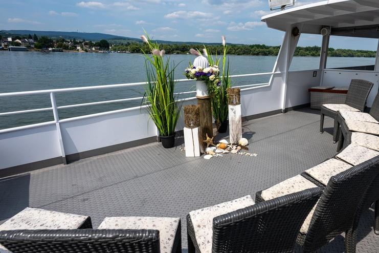 Im Anschluss an die Zeremonie fahren wir -auf Wunsch bei einer Tasse Kaffee und einem Stück Kuchen- zurück nach Budenheim wo wir uns nach insgesamt rund anderthalb Stunden verabschieden und gemeinsam von Bord gehen.